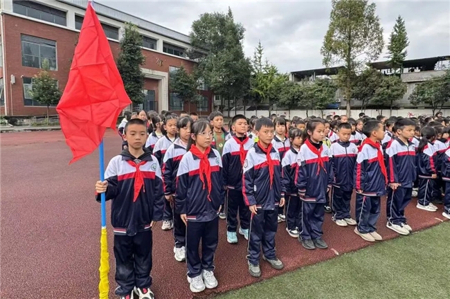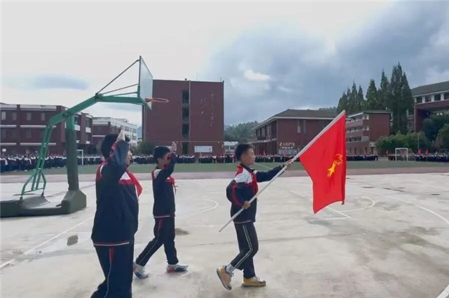 嘹亮的国歌声中,五星红旗缓缓升起,全校师生肃立,少先队员们行队礼,表达对祖国的深切敬意。