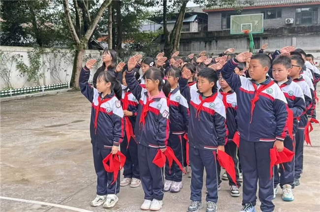 首先由夹关学校德育办杨主任宣布新入队名单,每一个名字都伴随着同学们热烈的掌声和祝福的目光,新队员们脸上洋溢着激动与自豪。随后,高年级的少先队员们逐一为新成员佩戴上鲜艳的红领巾,这不仅是荣誉的象征,更是责任与使命的传承。接着,全体少先队员齐唱《中国少年先锋队队歌》,歌声嘹亮,充满朝气,展现了少先队员们积极向上的精神风貌。最后,在辅导员的带领下,新队员们面向队旗,举起右拳,庄严宣誓,誓言中蕴含着对少先队组织的忠诚与热爱,以及对未来学习生活的坚定决心和美好憧憬。