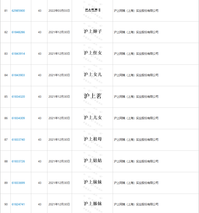 防御商标:包括各类“沪上”系列亲属称谓商标;