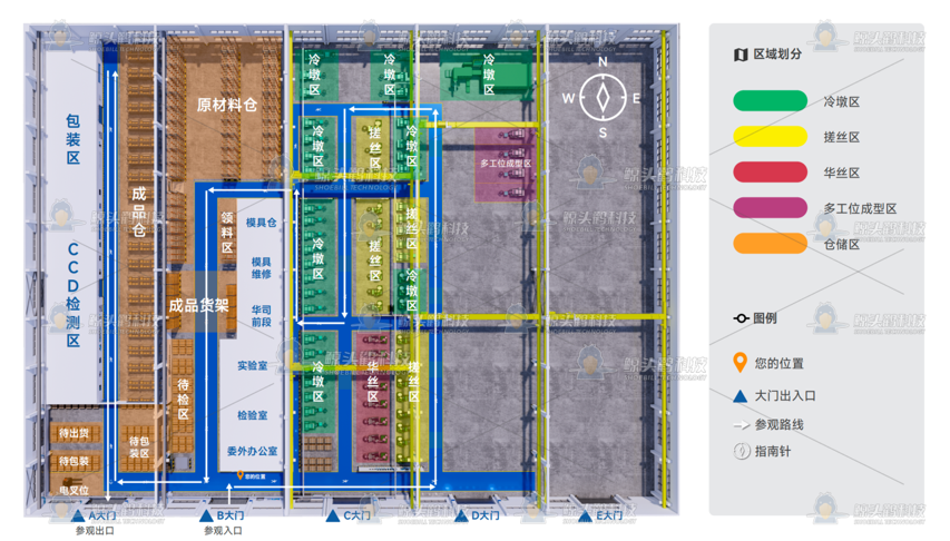 3.工厂高阶目视化:从客户参观角度规划参观路线,景点设计。打造最具行业标杆的工厂参观内容。从员工使用角度进行生产区域明确划分,让整个工厂极具透明化管理。