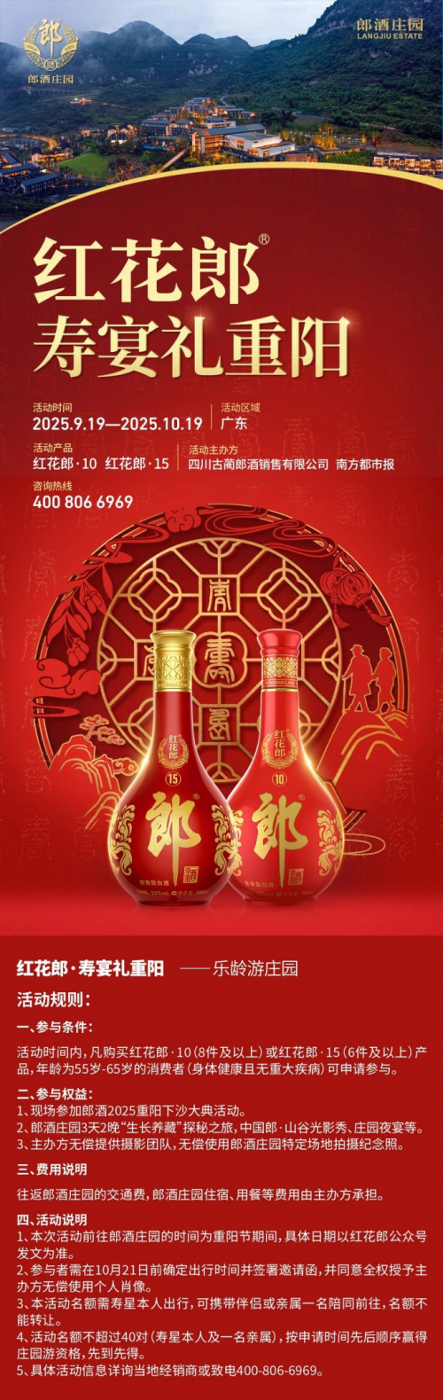 2025年9月19日至10月19日,广东区域消费者(年龄55岁-65岁),一次性购买红花郎·10(8件及以上)或红花郎·15(6件及以上)即可申请3天2晚郎酒庄园之旅,并有机会参与2025郎酒重阳下沙大典。(*活动名额不超过40对,包括寿星本人及一名亲属,按申请时间先后顺序赢得庄园游资格,先到先得)