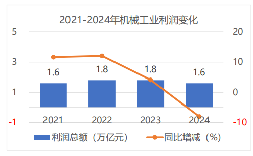 截至2024年末,机械工业共有规模以上企业13.2万家,资产总计39.4万亿元。2024年,机械工业实现营业收入31.5万亿元,实现利润总额1.6万亿元,外贸进出口总额1.17万亿美元,其中出口总额8693.6亿美元。