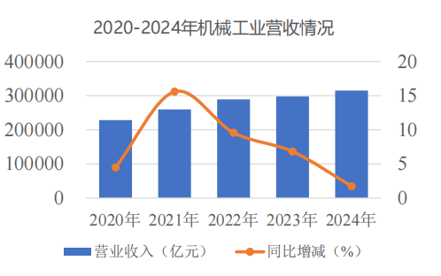 截至2024年末,机械工业规模以上企业数量从“十三五”末的9.2万家增至13.2万家,占全国工业比重从23.1%提升至25.8%;资产总计从26.5万亿元增至39.4万亿元,年均增长10.4%,较“十四五”初期增加了38.7%,占全国工业的22.1%。2024年,规模以上机械工业实现营业收入31.5万亿元,首次突破30万亿元大关,占全国工业的22.9%,比“十三五”末提高1.4个百分点。