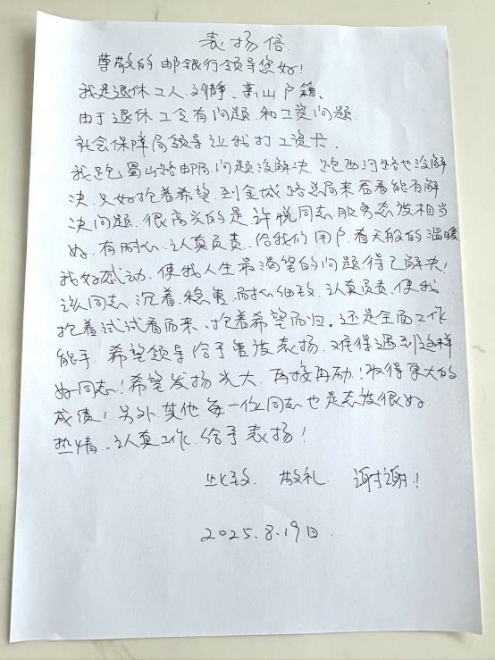 邮储银行杭州市萧山区支行工作人员依托柜面工作多年的宝贵经验,帮助客户找寻到解决问题的办法。阿姨的手写感谢信虽然是轻轻的一张A4纸,但在萧山区支行服务前线的员工心中,却是一份沉甸甸的认可!