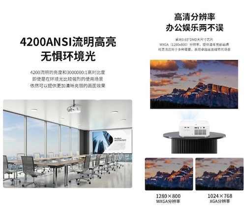 LSD400W搭载激光光源,亮度高达4200 ANSI流明,对比度高达3000000:1,结合WXGA(1280×800)分辨率,即使在强光环境下也能投射出清晰锐利的画面。无论是会议室的白天演示,还是教室中的多媒体教学,LSD400W都能确保内容清晰可见,文字锐利,图像细节丰富。