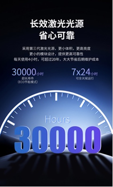 LSD400W采用第三代激光光源技术,模块体积更小,散热效率更高,具备更强的稳定性与可靠性。相比传统灯泡投影机,激光光源不仅亮度更高,而且在节能模式下可实现长达30000小时的使用寿命,免除更换光源的烦恼,显著降低后期维护成本与人力投入。