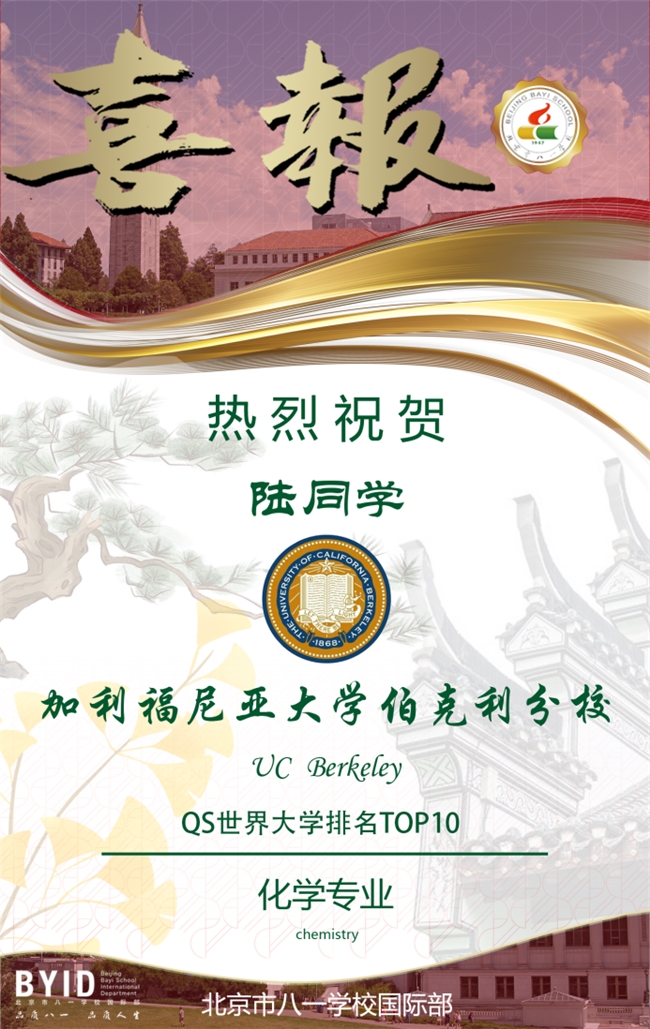 近日,八一学校国际部传来振奋人心的消息,该校陆同学成功拿到加利福尼亚大学伯克利分校化学专业的录取通知书。