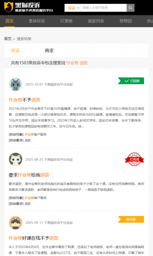 在黑猫投诉平台上,关于作业帮的投诉中,退款问题最为频繁。许多家长在投诉中表达了强烈的不满,一名家长举例称,自己的7岁孩子在未经授权的状态下,使用“帮帮识字”APP购入课程,提出退款请求时却被以“已结课”为由拒绝。