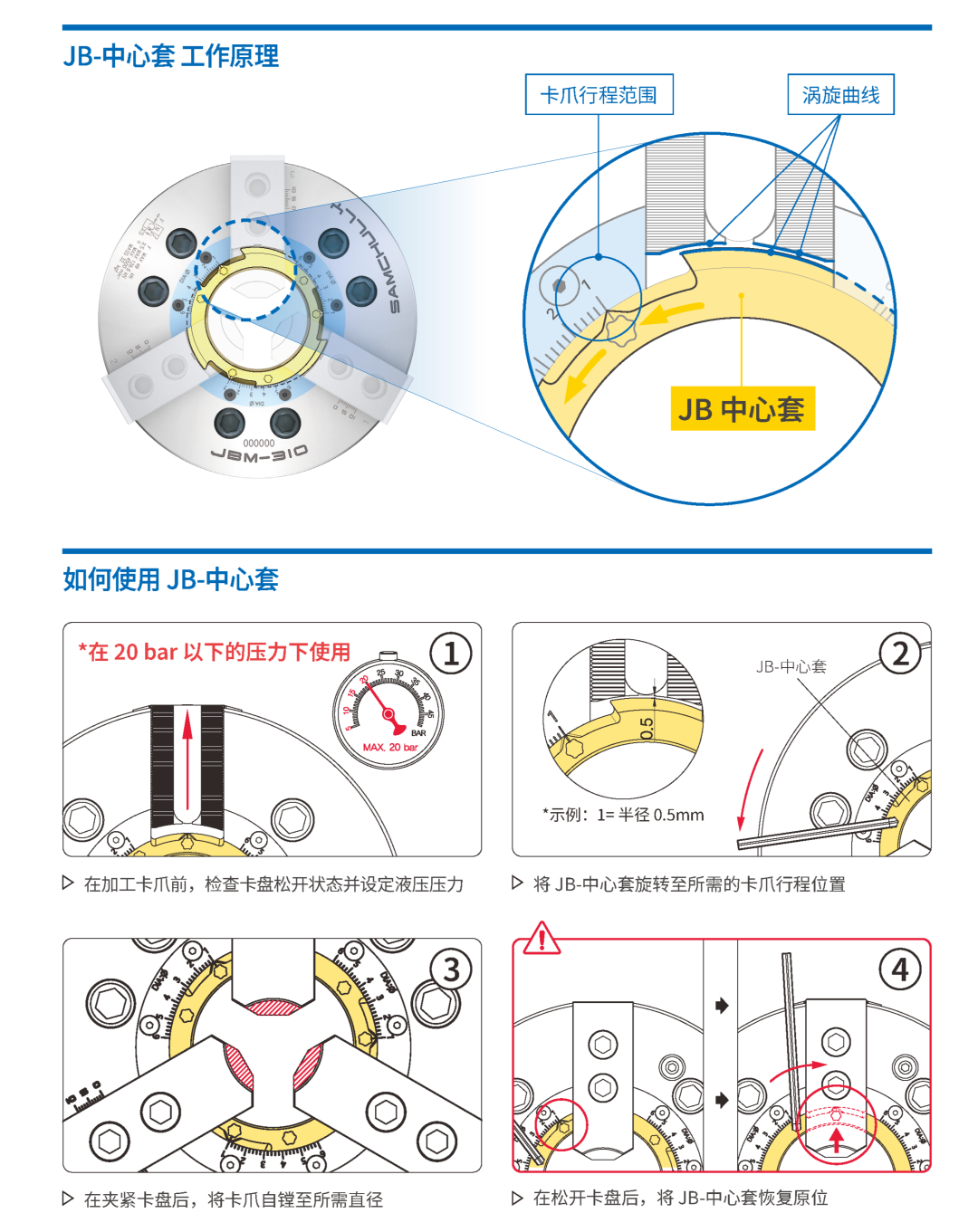 例如快修卡爪中空卡盘JBM/JBH系列,内置自修环实现快速修爪;自定心2+2爪动力卡盘IDF系列,加工矩形和方形工件的理想选择;自定心2+2+2六爪浮动卡盘IDS系列,薄壁工件(易变形的工件)的理想选择。
