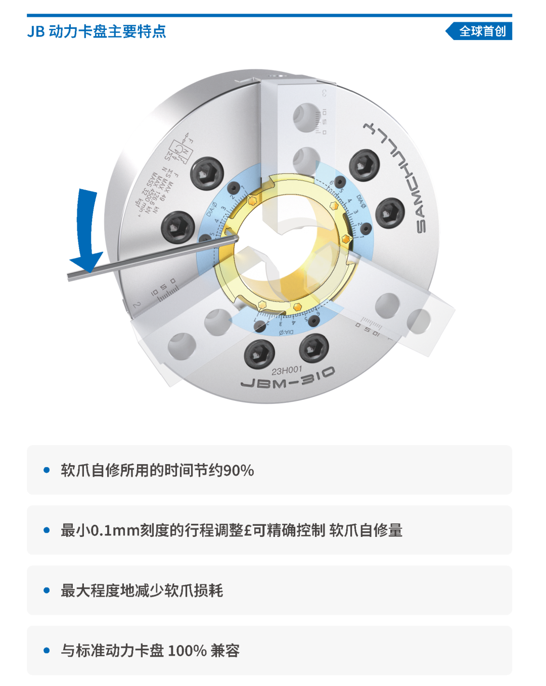 软爪自镗所用的时间节约90%,最小0.1mm刻度的行程调整,可精确控制软爪自修量,最大程度地减少软爪损耗,100%兼容现有产品的同时,大幅度提升重复精度和耐用性