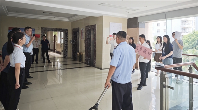 本次演练以“10余名客户因理赔争议聚集上访”为背景,采用情景再现方式还原突发事件处置全过程。模拟人员通过列队高呼诉求、情绪激动施压等行为,考验现场人员的应急反应与矛盾化解能力。随着“突发事件”警报拉响,值班人员迅速启动《重大保险消费投诉应急预案》,3分钟内完成应急指挥部组建,安保组、沟通组等多部门协同联动,有序开展警戒管控、诉求受理、法律解释等工作。