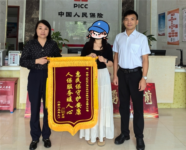 2025年9月30日,在国庆佳节来临前夕,中国人保财险河源东源支公司的大厅内暖意融融。重疾患者家属曾女士手持一面印有“惠民保守护安康 人保服务暖人心”的鲜红锦旗,紧紧握住工作人员的手,反复表达着内心的感激:“多亏了‘市民保’和你们的贴心服务,家里的经济负担减轻了不少,真是太感谢了!”