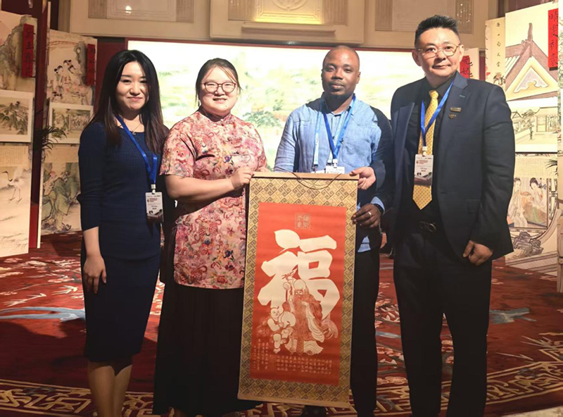 图:论坛现场向加纳总统赠送中国传统版画作品:福寿万吉,纪念中加两国65年的友谊。左起中国联合国采购促进会王天一、徐云、总统办公室秘书Atta Mills Protocol、世界消费人协会驻中国首席代表李立德