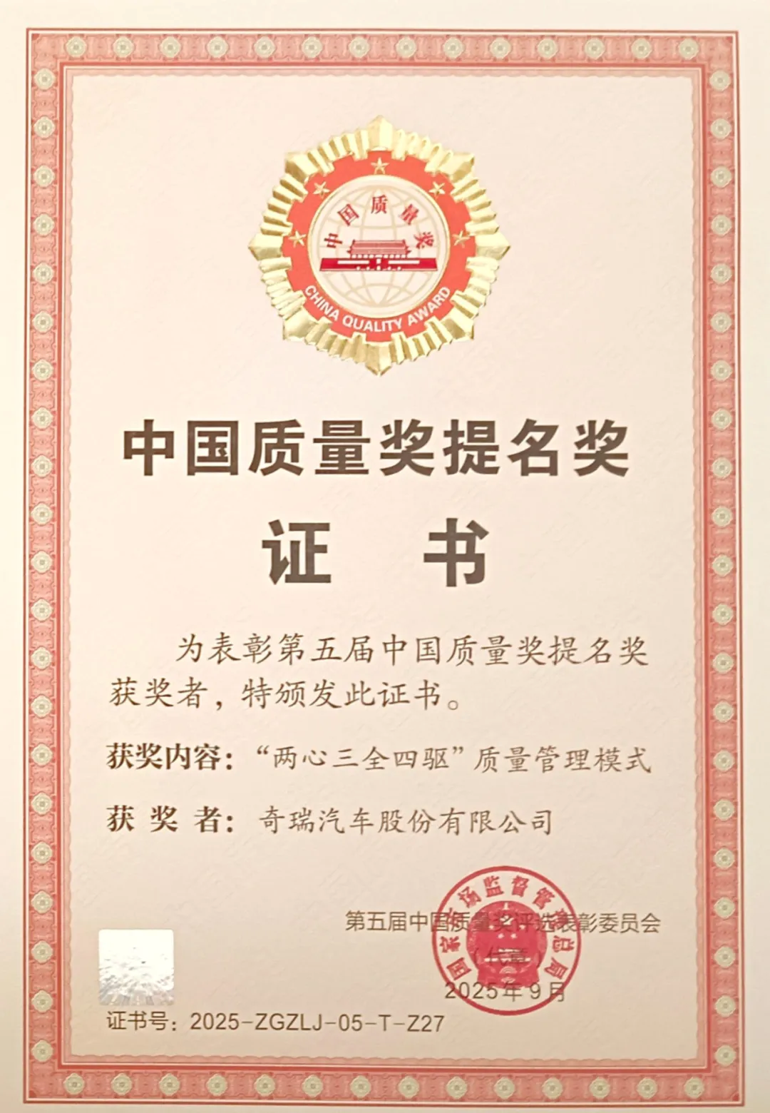 【奇瑞荣获中国质量奖提名奖】