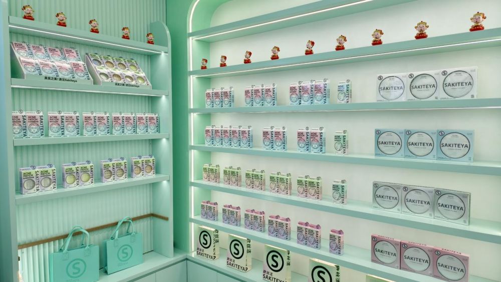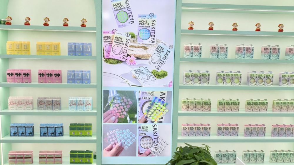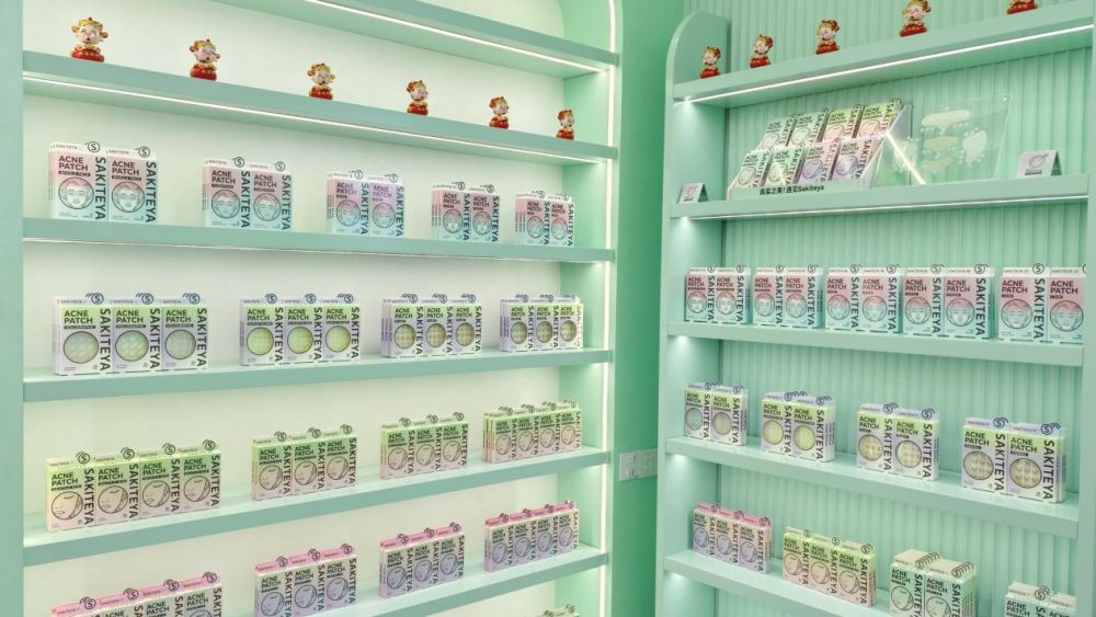 经典与创新痘贴区:日夜用款、积雪草款、水杨酸款等经典产品常年热销,年销超2700万片;同时陈列着全国首创的“全脸款痘贴”,覆盖T区与U区,为痘痘困扰者提供全面防护。