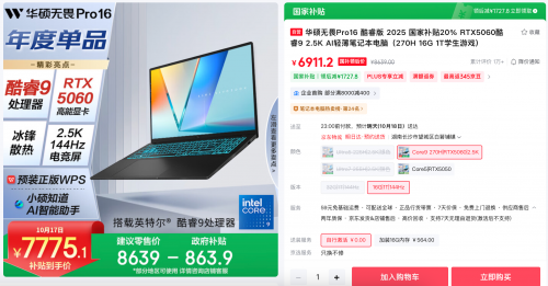 AI技术与轻薄本的深度融合,正重新定义生产力工具。双十一大促再掀换机热潮,如果你追求更高效、智慧的全场景用机体验,推荐你重点关注华硕无畏Pro16 2025,它搭载RTX 5060独显、“小硕知道”AI智能助手等,以卓越AI体验让办公、创作、游戏无需妥协,还配备2.5K 144Hz亮彩电竞好屏、酷睿9标压处理器等,助你解锁高能用机的全新维度。双十一大促购机部分地区可领取至高10%政府补贴(购机活动详情还请咨询店内客服),到手7775.1元。