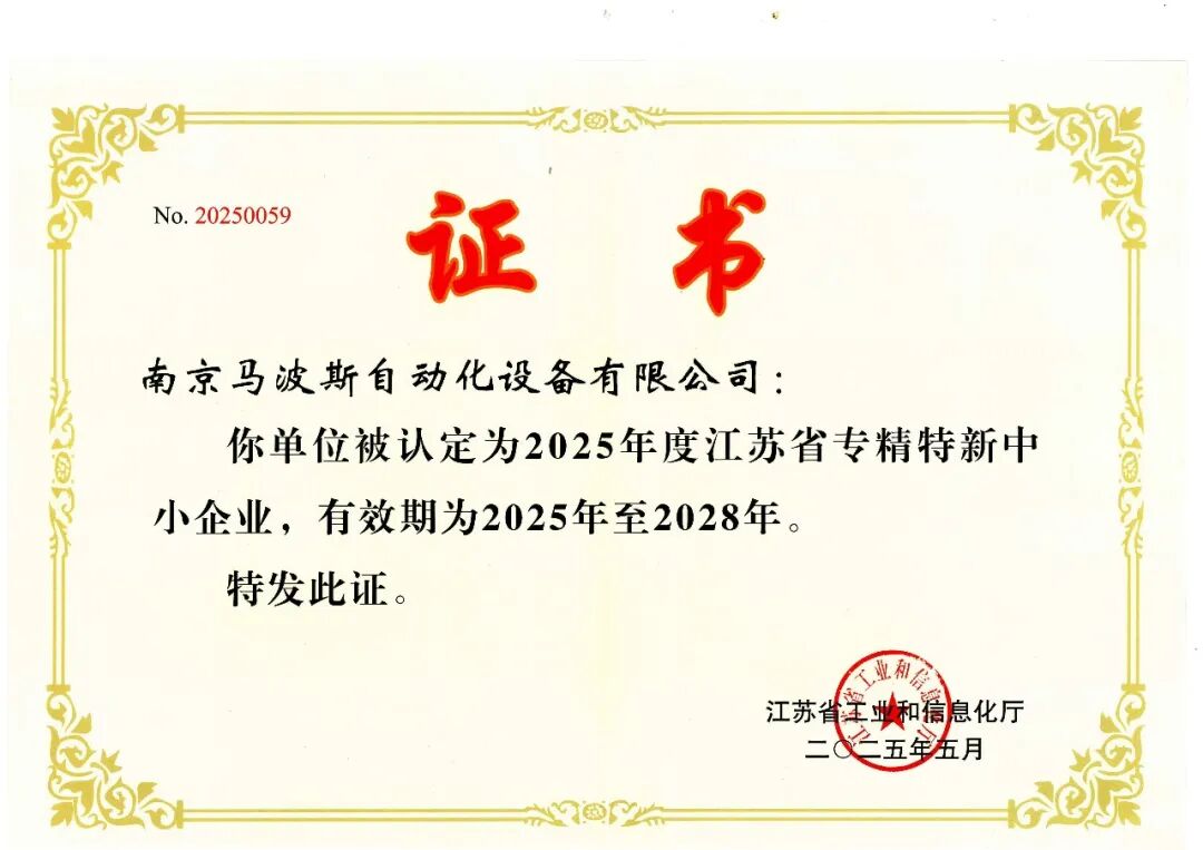 近日,江苏省工业和信息化厅正式公布了2025年度江苏省专精特新中小企业名单。南京马波斯自动化设备有限公司凭借其在工业自动化测量与控制领域深厚的技术积累、持续的创新能力以及显著的市场优势,成功通过审核,被认定为2025年度江苏省“专精特新”中小企业。