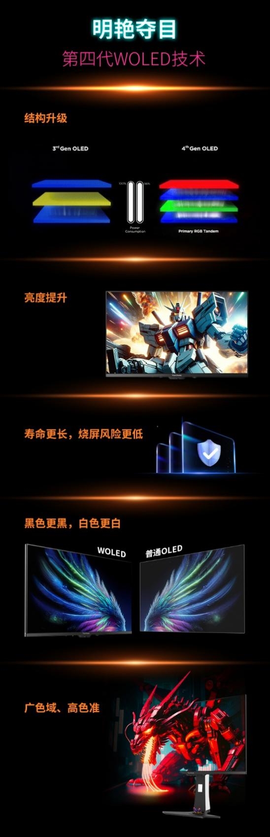 XG273F-2K-OLED采用第四代的WOLED面板技术,采用了名为“Primary RGB Tandem”的新型OLED结构,进而带来更纯净的色彩与更亮的画面。其拥有3686400个自发光像素点,实现1500000:1高对比度与1500尼特峰值亮度,色域广,色准高,在视觉体验方面实现质的飞跃。此外,配备专属亮面涂层,在色彩饱和度与黑色纯净度上实现双重突破:色彩比普通OLED更鲜活浓郁,黑色表现更胜一筹,呈现出更极致的深邃黑,还原画面本真质感。