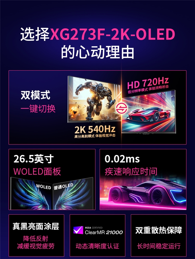 中国上海,2026年1月22日——优派(ViewSonic)正式发布全新双模OLED显示器XG273F-2K-OLED,专为电竞用户打造。该产品采用26.5英寸2K LGD-WOLED面板,具备2560×1440高分辨率,并拥有QHD 540Hz和HD 720Hz双模显示,同时满足3A大作和FPS游戏两类需求。该显示器通过VESA ClearMR 21000认证,配合0.02msGTG响应时间,给游戏玩家带来流畅的画质与跟手感。XG273F-2K-OLED拥有99.5%DCI-P3广色域覆盖、1,500,000:1对比度与原生10bit色深,并且每台出厂进行精准校色,△E<2,呈现更真实细腻的色彩表现。其外观采用黑白撞色,充满科技感,搭配星际灯效和Y字形底座,简约时尚;配备双HDMI2.1接口和双DP1.4接口,满足多设备连接需求。
