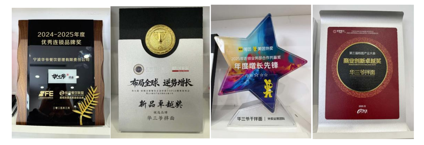 2025年,华三爷拌面在行业内的专业评选中屡获认可,四座奖杯分量十足: