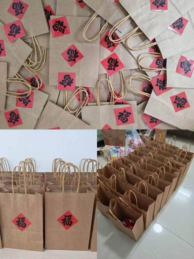 在前期礼物筹备阶段,如何为学弟学妹们送上一份既实用又承载祝福的礼物,成为实践队队员们热议的话题。经过反复讨论,队员们最终确定了充满巧思的“惊喜福袋”方案。大家选用了简约质朴的牛皮纸袋,并在每个袋子上亲手贴上红色的“福”字,让普通的纸袋瞬间充满了温暖的仪式感与新年祝福。袋中装有设计精巧的迷你台历,寓意珍惜光阴、见证成长;还贴心准备了独立包装的糖果、饼干等小零食,希望能为紧张备考的学子补充能量、甜润心田。从挑选材料到亲手装配,每一个“福袋”都凝聚着实践队队员们的用心,这份简单而真挚的礼物,承载着对母校学子最深切的关怀与鼓励。