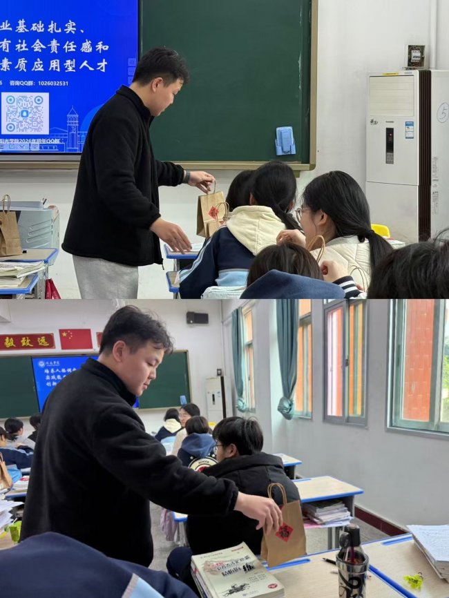 活动的最后,实践队员们将精心准备的“福气袋”送到每一位学弟学妹手中。简约的牛皮纸袋上,亲手贴上的“福”字格外醒目;袋中,小巧的台历与独立包装的小零食,承载着贴心与祝愿。当一份份满载心意的礼物被传递,温暖的欢笑与惊喜的轻呼在现场流转。这份虽不贵重却亲手备妥的心意,比言语更具体,比祝福更长久。愿这份“福气”能陪伴他们度过拼搏的日夜,在倦怠时带来一丝甜意,在提笔时记取一份鼓励。