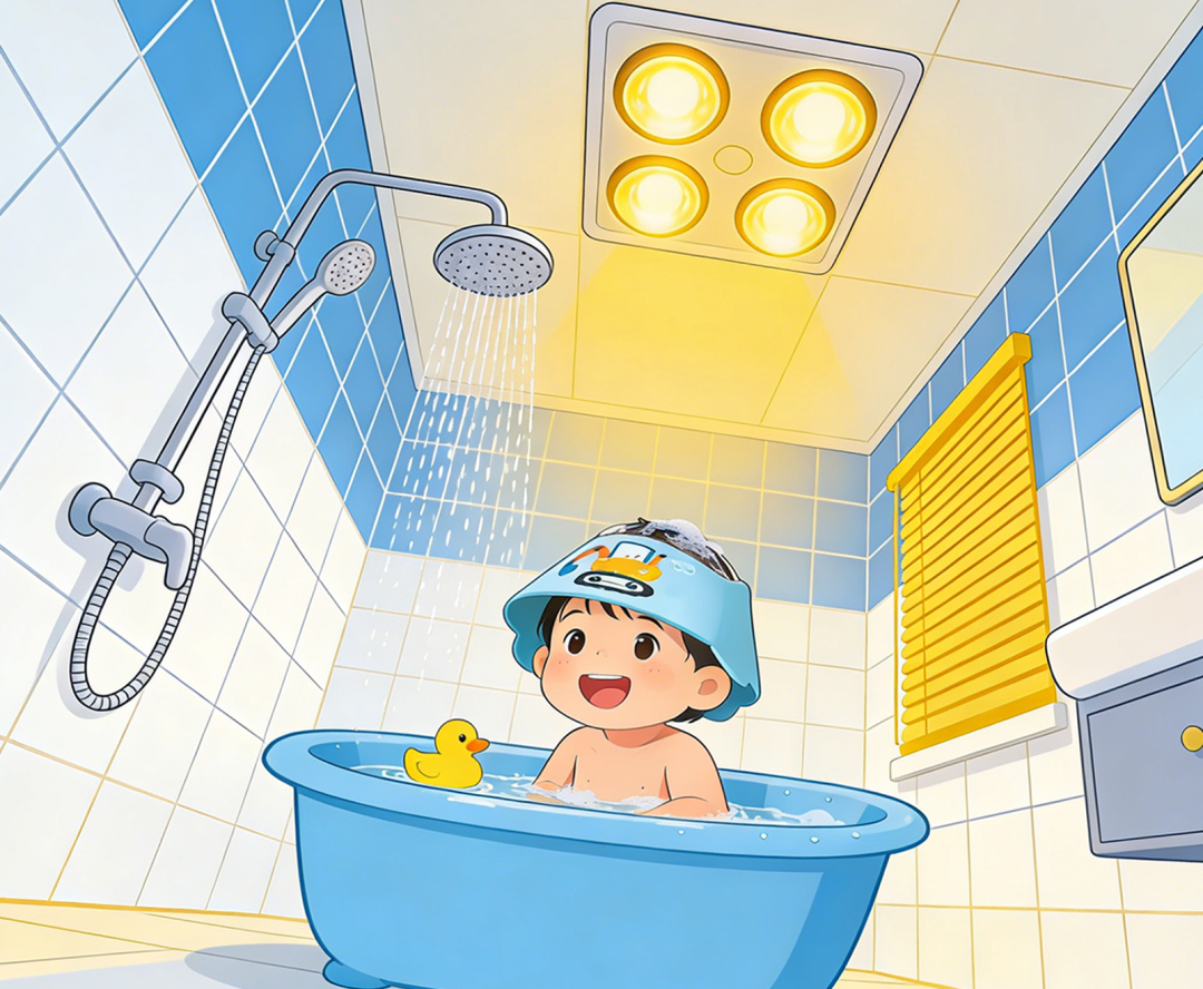 提前预热,人进灯关:洗澡前5-10分钟开启浴霸升温,温度适宜后完全关闭,再带宝宝进入浴室;绝对避免直视:若必须临时开启,调整宝宝体位或照射角度,严禁灯光直射宝宝面部、眼睛;物理遮挡防护:给宝宝戴宽檐浴帽,阻挡自上而下的强光,进一步降低风险。