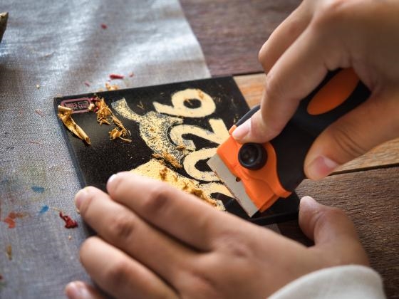 在惠和石文化园,被誉为“石头上的刺绣”的影雕,让实践团领略了闽南石雕的细腻。市级传承人戴毅安为大家讲述影雕“以针代笔、以石为纸”的技艺精髓,成员们手握2斤重的特制钢针,在黑胆石上尝试凿刻,从针尖打滑到慢慢摸索出“力要沉、点要准”的诀窍,在细密的针点中勾勒出简单的纹样,深刻体会到这项需六年方能初成的技艺,背后是时间与耐心的沉淀。而戴毅安将影雕做成茶碟、盲盒等文创,两年售出逾两万件的创新实践,更让实践团看到非遗融入日常的无限可能。