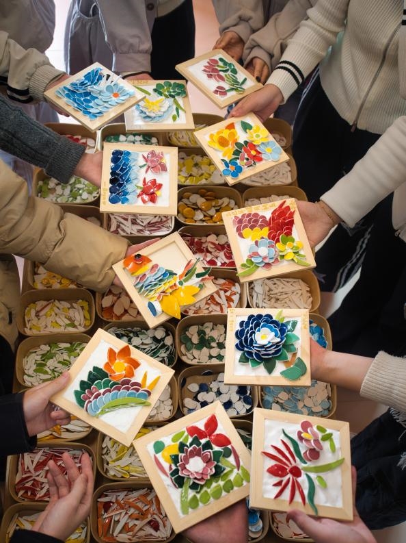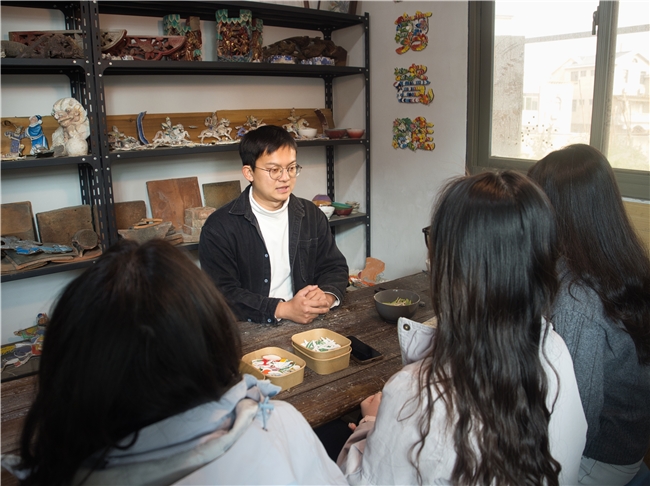 实践团的厦门非遗之旅,在剪瓷雕的“化碎为整”中落下精彩一笔。跟随家族第五代传承人林欣墙,成员们仰望古厝屋脊上由碎瓷片拼嵌的流光溢彩的龙凤图案,心生震撼。在工坊里,大家戴上线手套,用钳子小心翼翼修剪瓷片,在木制画框上铺泥、镶嵌,从挑选瓷片到按压成型,力道稍大则瓷片碎裂,手法稍轻则难以立体,一番操作后,原本松散的碎瓷片,在成员们的掌心变成了红鲤、浪花等生动的小品。林欣墙“北方青砖雕一体成型,南方剪瓷雕化零为整”的解读,更让实践团对南北非遗的差异有了直观认知。