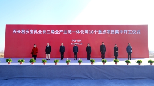12月6日,滁州天长举行君乐宝乳业长三角全产业链一体化等18个重点项目开工仪式。滁州市委书记吴劲出席并宣布项目开工。滁州市委副书记、市长胡春华致辞,君乐宝乳业集团董事长兼总裁魏立华出席仪式。项目位于滁州天长市食品小镇,聚焦奶源基地与液态奶生产基地建设,覆盖奶牛养殖、乳品加工等全产业链环节,打造一体化产业集群。