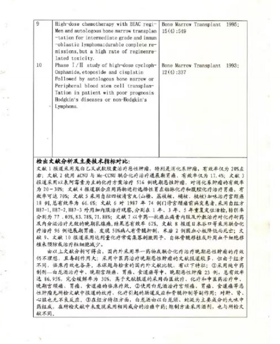 1999年国家科委委托重庆市科委组织重庆市卫生局、重庆市药监局、中国第三军医大学西南医院、新桥医院、大坪医院等9个单位的国家级专家,对治癌药物白龙酒在西南医院、新桥医院、大坪医院临床六年的疗效按照国际标准查新、鉴定,取得的《科技查新报告》第四页载明:检出文献分析及主要技术指标对比:治癌药物白龙酒的临床疗效高于国内外文献报道的采用放疗、化疗和中医药治疗中、晚期宫颈癌、胃癌、食道癌的临床疗效的证据。