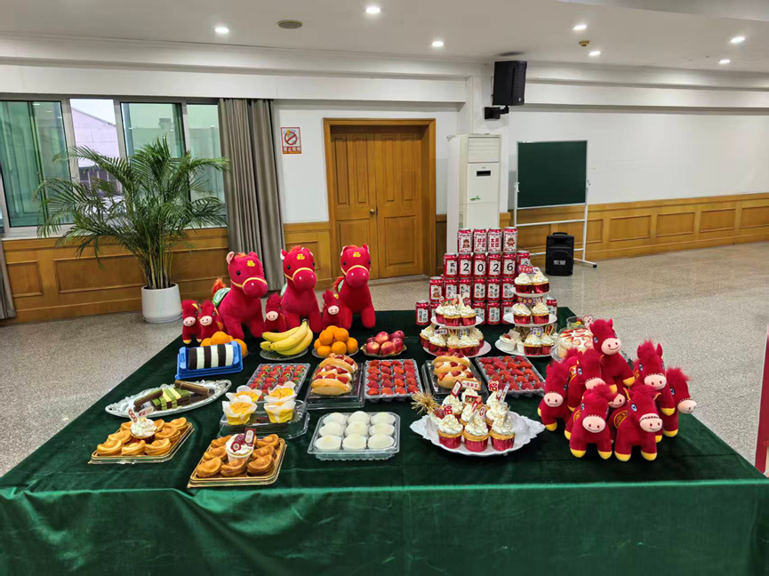 活动现场张灯结彩,“欢乐猜灯谜”区域挂满了色彩缤纷的灯谜条,大家踊跃参与、热烈讨论,在趣味互动中感受传统民俗魅力。茶歇区精心准备了蛋糕、水果、坚果及定制饮品,搭配寓意“马到成功”的红色小马玩偶,让大家在品尝美食的同时,收获满满的节日惊喜。