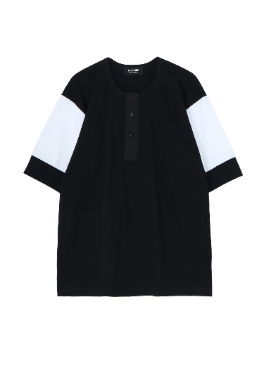 本系列推出一款采用衣身与袖子拼色设计的双色亨利领T恤。
