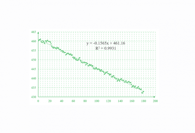 图中可见,在测量箱关闭期间(通常1-3分钟),CO₂浓度呈现理想的线性下降趋势(斜率 dC/dt<0),表明植物正常进行光合作用,仪器响应灵敏。基于该斜率及箱体体积、温度、气压等参数,软件可自动计算冠层净光合速率(Ac),并输出R²等质控指标,确保数据可靠性。