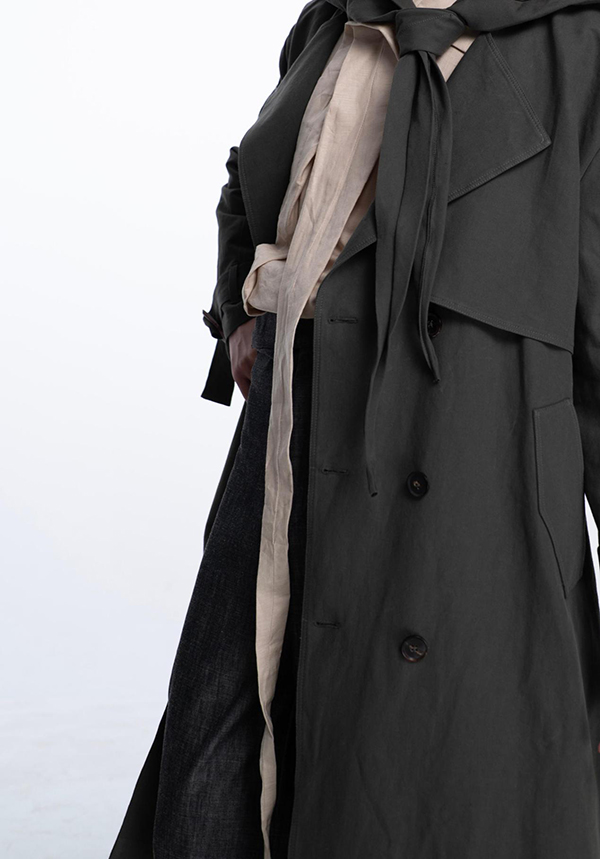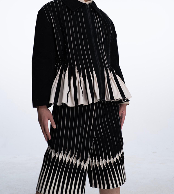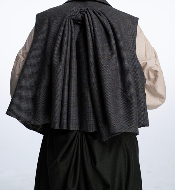 在系列的构造实验中,可以看到设计师对材料反应的敏感度。例如利用室内装饰中被弃置的天鹅绒黏合材料叠加在旧面料之上,使布料在收缩过程中自然形成向内聚拢的体量。另一组实验则借鉴罗马帘系统的原理,通过内部拉绳装置调节面料的收紧与释放,让衣身在穿着状态中形成可变化的体积关系。与传统男装依赖复杂版型塑造轮廓的方式相比,这些实验让材料本身参与到结构生成之中。