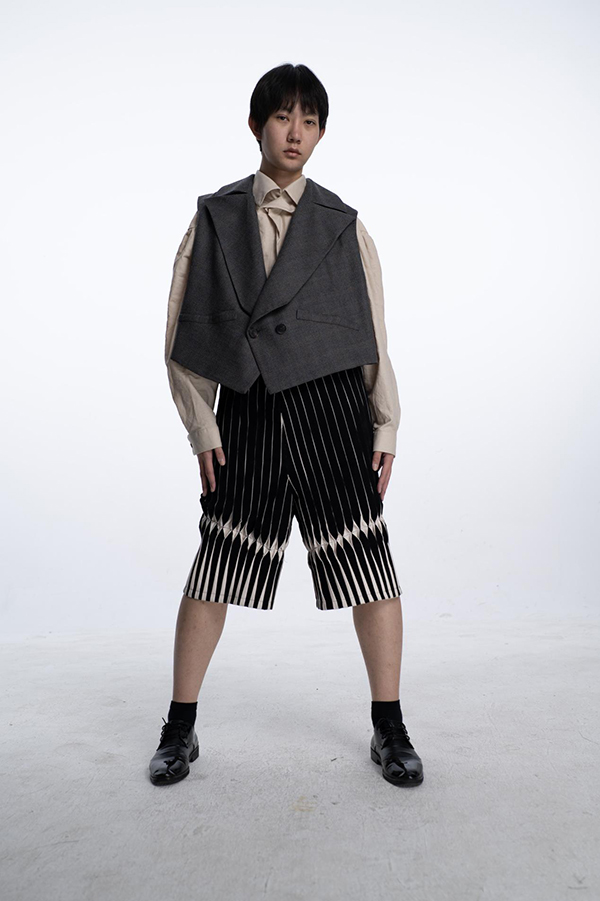 这种对结构与材料行为的关注,与程瀚葳早期对军装系统的研究形成了延续。男装历史中大量轮廓源自制服与功能性传统,而在他的这一新的项目中,程瀚葳逐渐将这种语言从军事叙事中抽离,转向更加开放的形式探索。设计减少了明显的符号指向,而将重点放回服装本身。裁片如何连接,材料如何弯曲,体量如何围绕身体展开,都成为塑造造型的关键因素。系列因此呈现出一种克制而理性的结构气质。