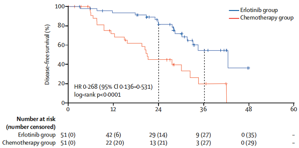厄洛替尼组的中位无病生存期(DFS)优于化疗组[3]
